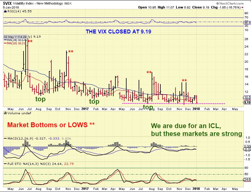 Reminder: On Jan 3rd, I posted this SPX / VIX chart. The VIX is trading in the 9 range, and that is usually when tops occur. Also, this is looking more and more parabolic as time goes on, so dips may not be all that deep if this keeps up.