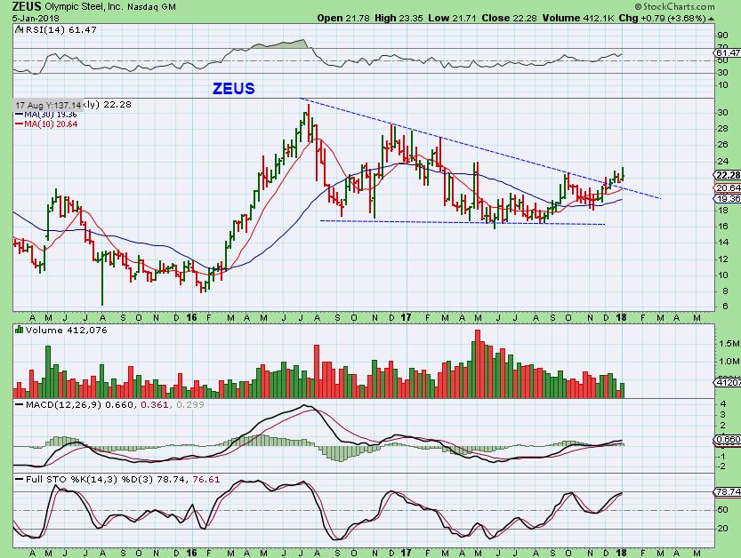 ZEUS – Another STEEL stock breaking out on a weekly chart. Lows came in this summer on many Steel stocks, but some are slower movers than others.