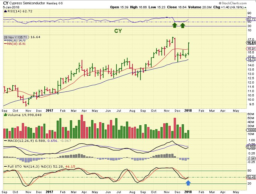 CY – Cypress also had a good week after a November slam down. It looks like it wants to run now. The correction in semi s seems to be ending on the first week of 2018.