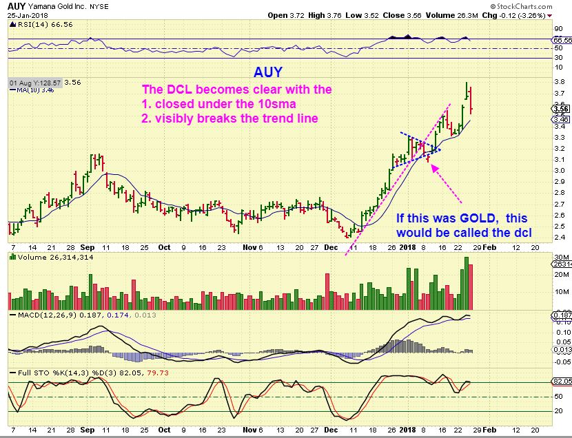 AUY AS GOLD – I am simply using this up to date chart to show how AUY acted the way we want Gold to act. It acted bullishly after the cup finished. You can clearly see the Trend line break & 10sma violated & recovered in the cups handle. MAYBE we get this in Gold now, if the USD simply puts in a weak dcl bounce?