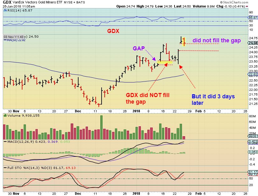 So in this chart of our current run, GDX & GDXJ were reversing higher even before GDX closed the gap Thursday. I wanted to point out the gap from JAN 15 and how it did NOT fill over the next 6 days, but it did fill later. Then our current gap filled by the end of the day, so this is just a lesson for another day. 🙂
