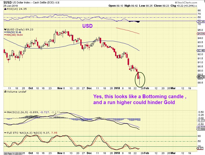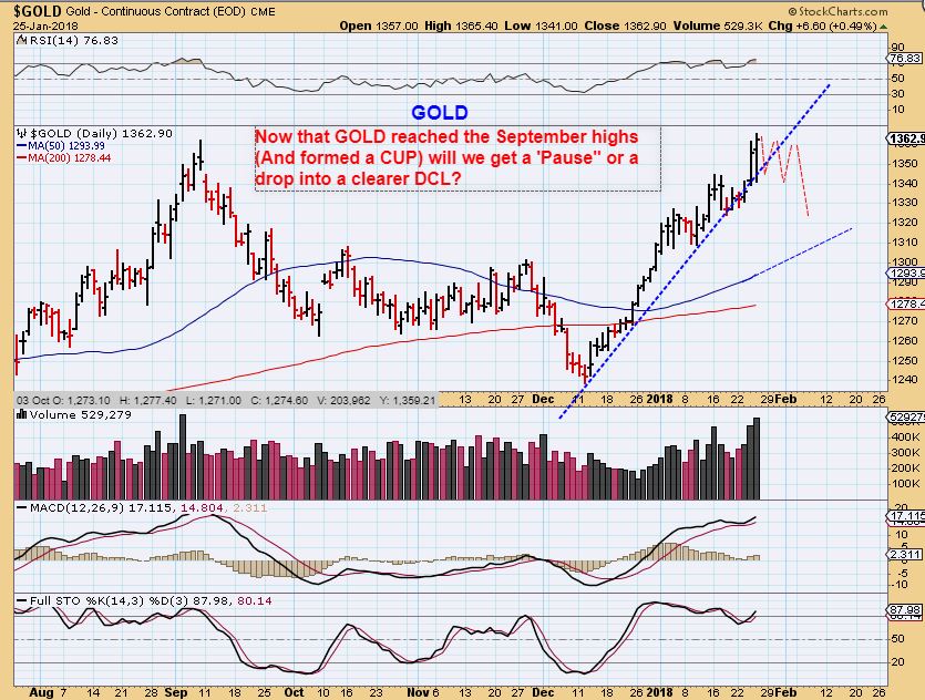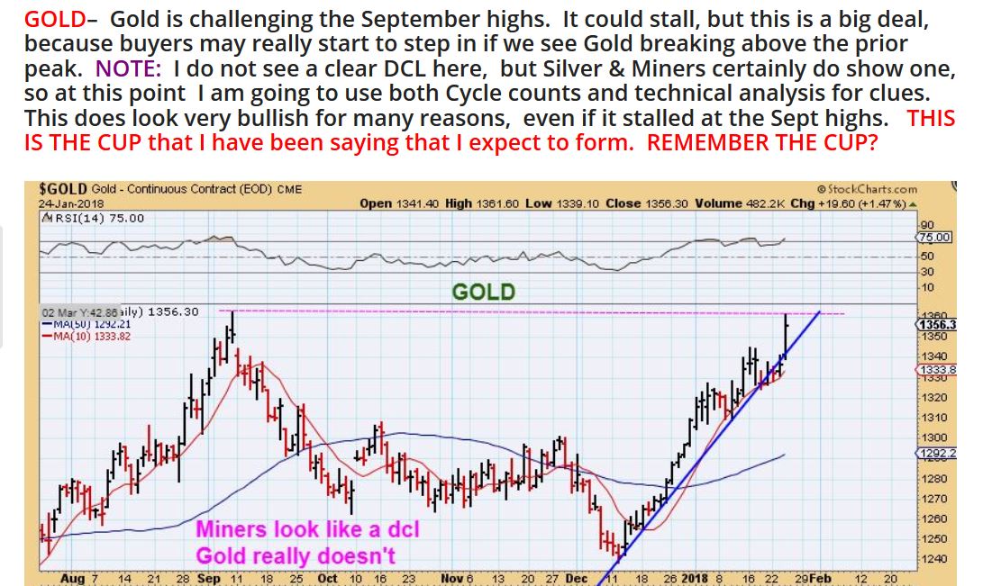 AS A REVIEW: The USD has been dropping, and Precious metals have been running higher since Mid Dec. We had a pretty clear dip in Silver and the Miners recently that looked like a DCL. Gold had smaller dips along the way, but I did mention that it just didnt have a CLEAR DCL. I accepted that maybe it had a milder dcl, since the Silver & Miners look to have. As for Gold- it was on a mission and kept moving higher towards the September highs, forming a cup that I did expect it to form.