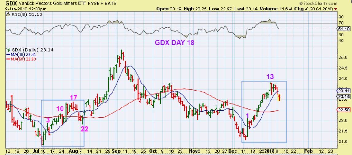 Personally, I’d like to see gold continue to flag or even pop (this morning is a good start!) because if it decides to drop already into a DCL, a day 13 top is miners is not ideal, imo. I am still leaning in the positive direction but the action so far this week did grab my attention somewhat.