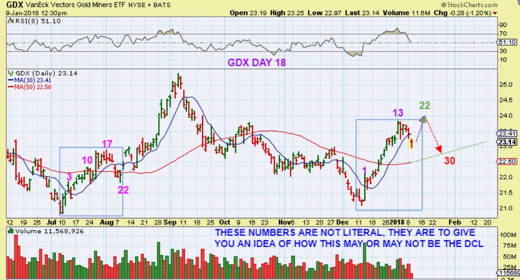 GDX 2 scenarios – So we could get a bounce, double top on a higher daily cycle number and then a dcl drop as shown. That shouldn’t surprise us if it happens.