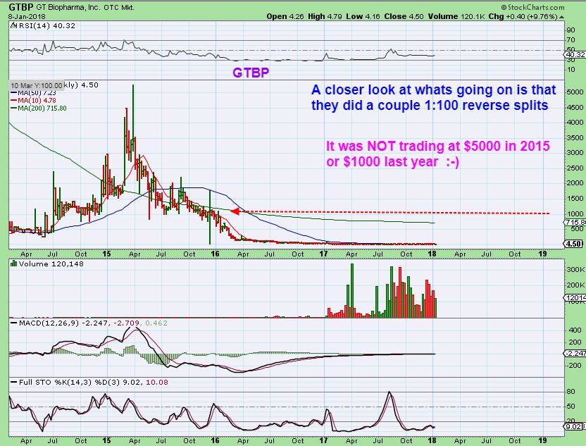 GTBP CHART 3 of 3 – It did NOT trade at $5000. This has had very large 1:100 reverse splits ( More than one). I believe that after those splits, it kept sinking and now this stock would really be trading at less than a penny. If you trade it, make sure you either check their fundamentals in case they are planning to go Bankrupt, or make sure that you can lose all that you invest in it. And yes, it could double, triple, quadruple too. That is my opinion on GTBP. 🙂