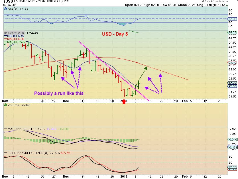 USD – We have our swing low (Expected) and Gold , Silver, and the Miners are Pulling back ( Expected). This is day 5 and it could ‘peak’ at the 50sma around day 10 or so, or remain weak and meander sideways.
