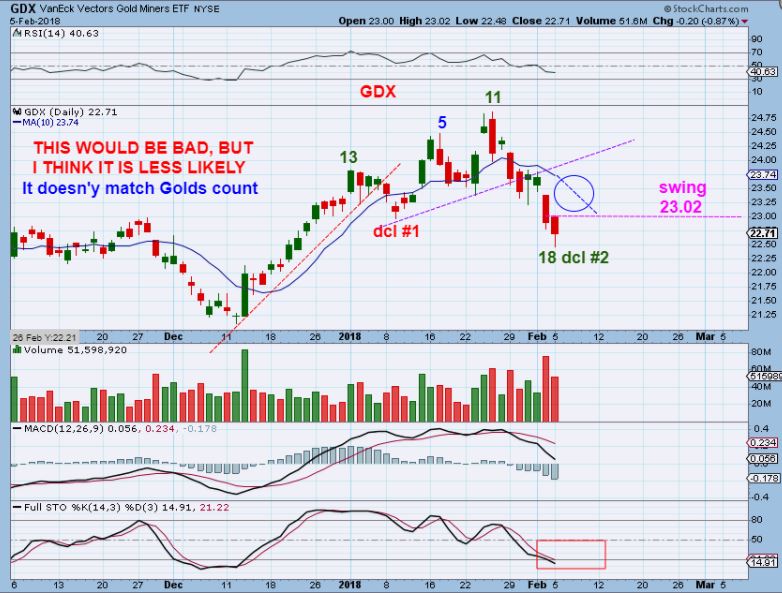 Alex, GDX LEAST LIKELY SCENARIO, and thanks for saying least likely. It lets me know which way you are leaning and this is just a possibility. BUT, If this were to happen, it would kind of lean towards the BULL being dead! Wouldn’t you think? I would suspect we would make new lows by the end of the 4th or 5th DC.