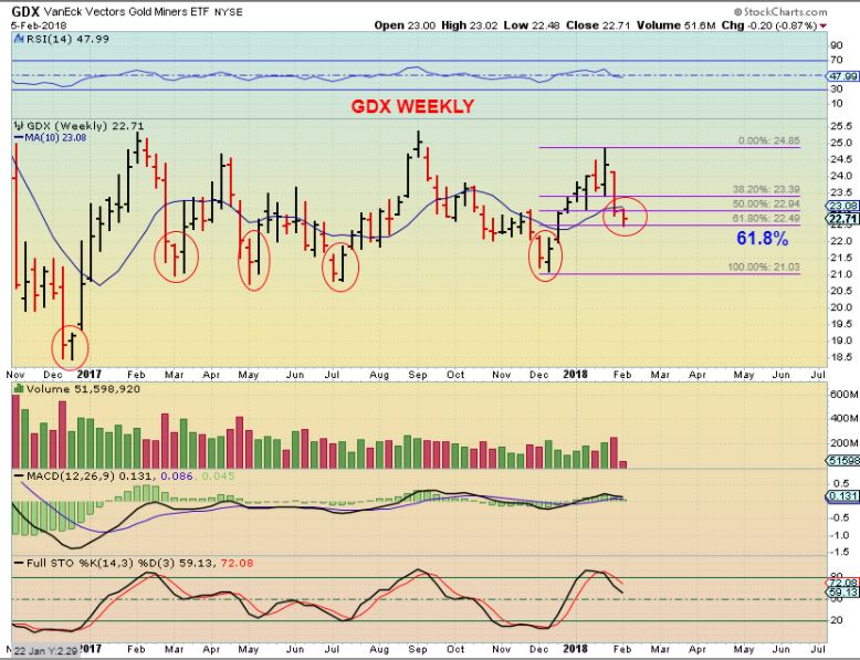 GDX WEEKLY– The weekly chart shows that GDX tagged that 61.8% fib retrace area. We would like that to hold.