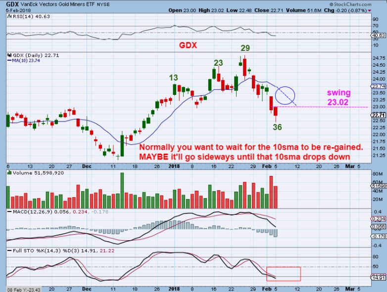 GDXJ – At the open I posted this just to show what I was watching for and hoping for. This small drop at the open gives us a new lower low, and this eases the parameters for a swing low. The 10sma is way up there, so it will be hard to wait for a confirmed swing low. Maybe a close above the 50sma would allow a buy with a stop. Next chart…
