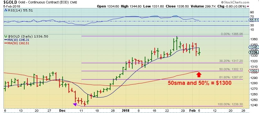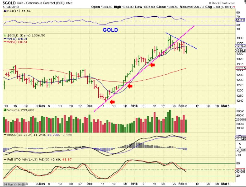 GOLD – Gold did not sell off with the USD rising, it actually closed a bit higher than stockcharts shows at $1339. See the next chart.
