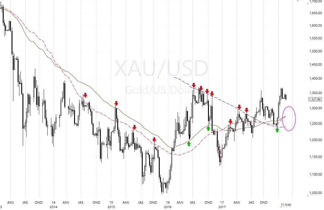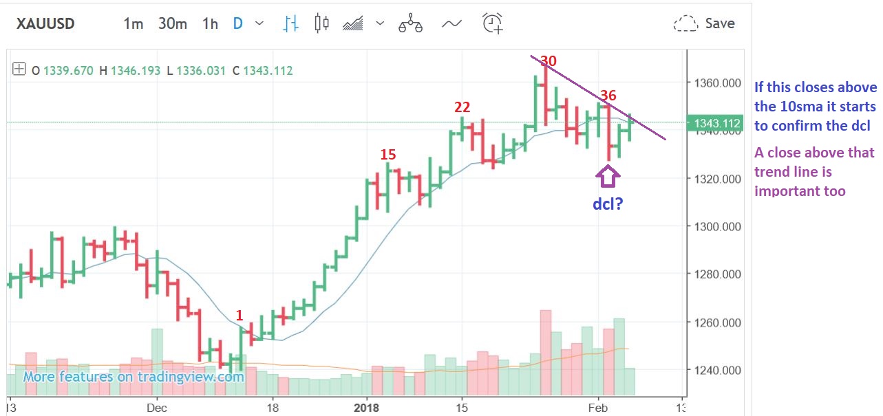 Got it. That helps frame the probability a bit better. Also, the 10 sma didn’t turn down during those slight breaks, which I’ve learned is usually a criteria for a DCL. So hopefully, that further lowers the probability of gold having a left translated IC.