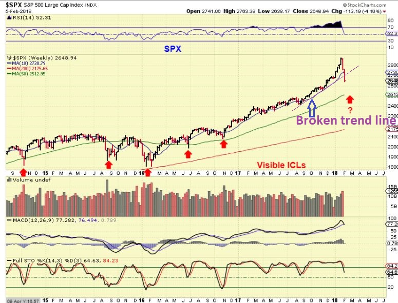 SPX WEEKLY – This was an extremely right translated intermediate cycle, so we really would not expect it to top here. The trend line break on this weekly chart indicates a drop into an ICL is likely taking place though.