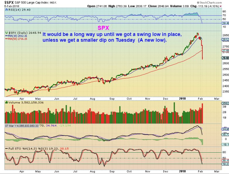 SPX – The daily chart shows what a drastic sell off that was on Monday. December and January gains are gone in a couple of days, unless one locked them in with a trailing stop or just liquidated on Friday. This is not a ‘safer buy’ without a swing low. Some bought on Friday ( buy the dip) and got smoked on Monday. Please read the chart. We hope for an undercut & reversal to lower the parameters on Tuesday.