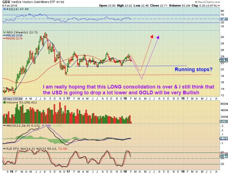 GDXJ – For the weekly, it looks like this IF THE LOWS HOLD . Please read the chart.