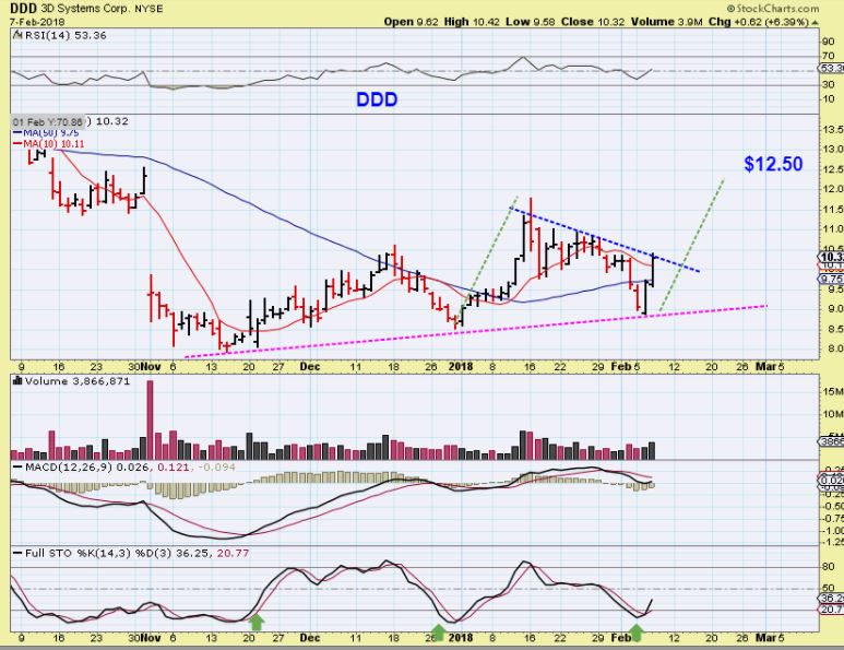 DDD – With such a big sell off in the markets, DDD is making higher lows, resisted panic selling, and is trending higher since that gap down. It has increasing volume from this oversold position. A break out could run to $12.50. A nice short trade, use a stop.