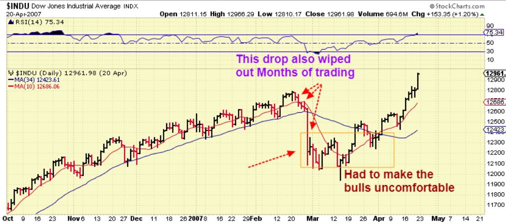 DJIA #3 – That drop wiped out weeks or months of trading too. No V-Bottom. Notice that jumping in heavily leveraged would have been difficult to endure during weeks of repair work. In 11 days it actually broke the lows too.