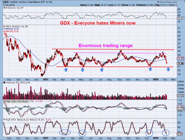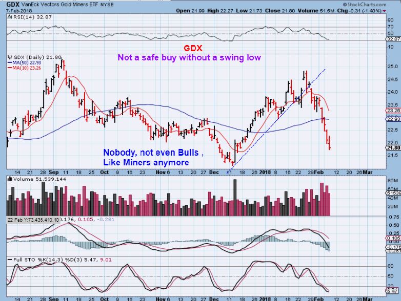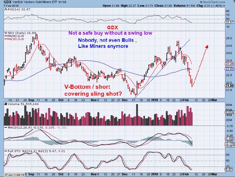 GDX #1 – With selling everyday, the Miners have not been a ‘safe buy the dip’ either. Some are holding up, others are dropping off. We have not had a swing low to buy safely anyway yet. I mentioned that I liquidated everything on Friday, because when you get a massive sell off starting in every sector- it is best to clear your head, step to the sidelines, and watch how it plays out. GDX is oversold & will probably flip higher when Gold does.