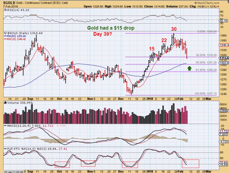 GOLD – Gold finally picked up on the selling. “Running the stops” on the intraday chart to $1300 is also the 50sma and 50% drop, so I am watching that area. I would LOVE to just see this happen overnight & reverse, but we’ll see how this plays out. NOTE: GOLD STILL LOOKS NORMAL USING CYCLES.