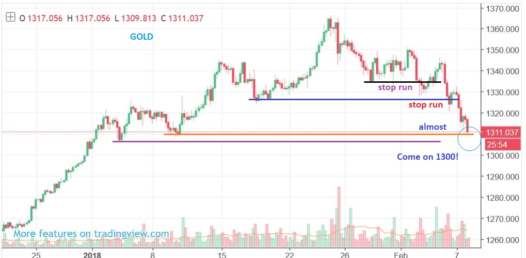 GOLD from yesterdays report, when I discussed my thoughts on “running the stops” on the intraday chart. We would drop to $1300ish to run them all.