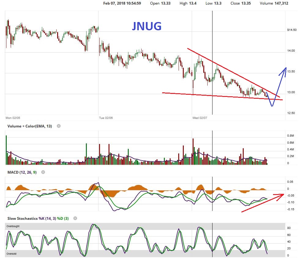 JNUG – When GOLD was GREEN at the open, GDXJ Gapped down & recovered. Then as GOLD sold off down $15, GDXJ slowly dropped back down, but only to its former morning lows, a double bottom on light volume & formed a wedge. I said in the comments section that I was going to buy JNUG at that double bottom ($13 with a semi tight stop). I drew this chart.