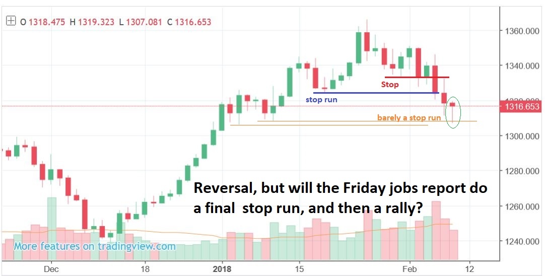 GOLD from yesterdays report, when I discussed my thoughts on “running the stops” on the intraday chart. We would drop to $1300ish to run them all.