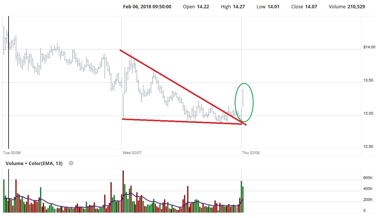 JNUG – When GOLD was GREEN at the open, GDXJ Gapped down & recovered. Then as GOLD sold off down $15, GDXJ slowly dropped back down, but only to its former morning lows, a double bottom on light volume & formed a wedge. I said in the comments section that I was going to buy JNUG at that double bottom ($13 with a semi tight stop). I drew this chart.