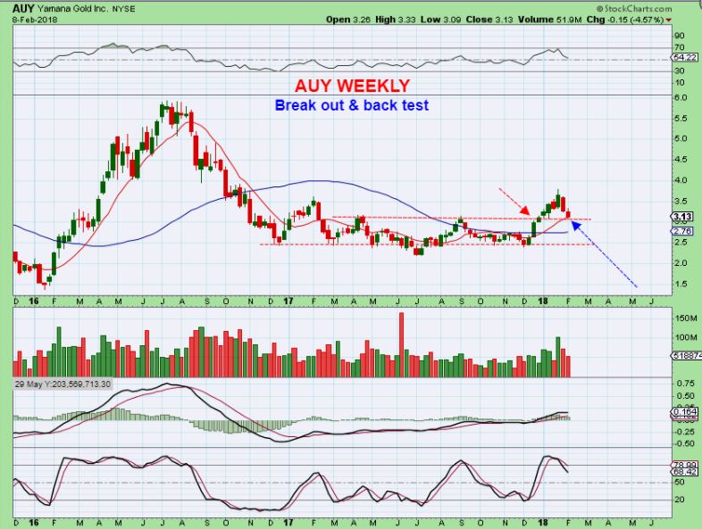 AUY WEEKLY – AUY broke out from a solid base and is back testing. If Gold does reverse & rally, I’ll buy this. See the chart.