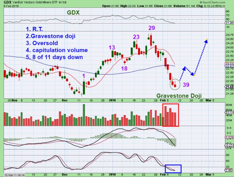 GDX – This is very similar to a flat gravestone doji, but I often call it an ‘ inverted hammer’. This often ends a sell off, and as you very well know, this was certainly a day after day after day sell off. Please read the chart.
