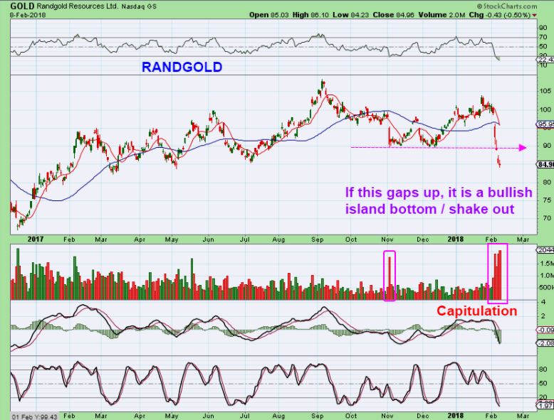 GOLD  (Randgold) – Massive volume in this one as it broke the lows and ran some stops.  Randgold has held up bullishly since the 2016 rally.  If it recovers, it could be a ‘stop run’. See the chart.