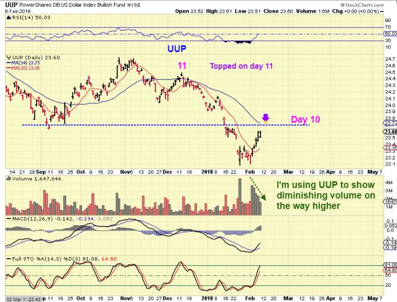UUP  (for the USD)- I’m using this for volume. It looks like the USD is topping and that would be the L.T. Daily cycle that I want, to ‘top’ the dollar, and ‘bottom’ Gold & Miners.