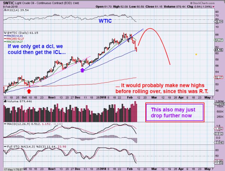 WTIC – Oils selling is finally taking place.  This may just sell off into an ICL, but IF we get a bounce,  it could be that we put a dcl in place.  The next daily cycle should be L.T. ( That will a good time to buy SCO or DWT). See the chart.