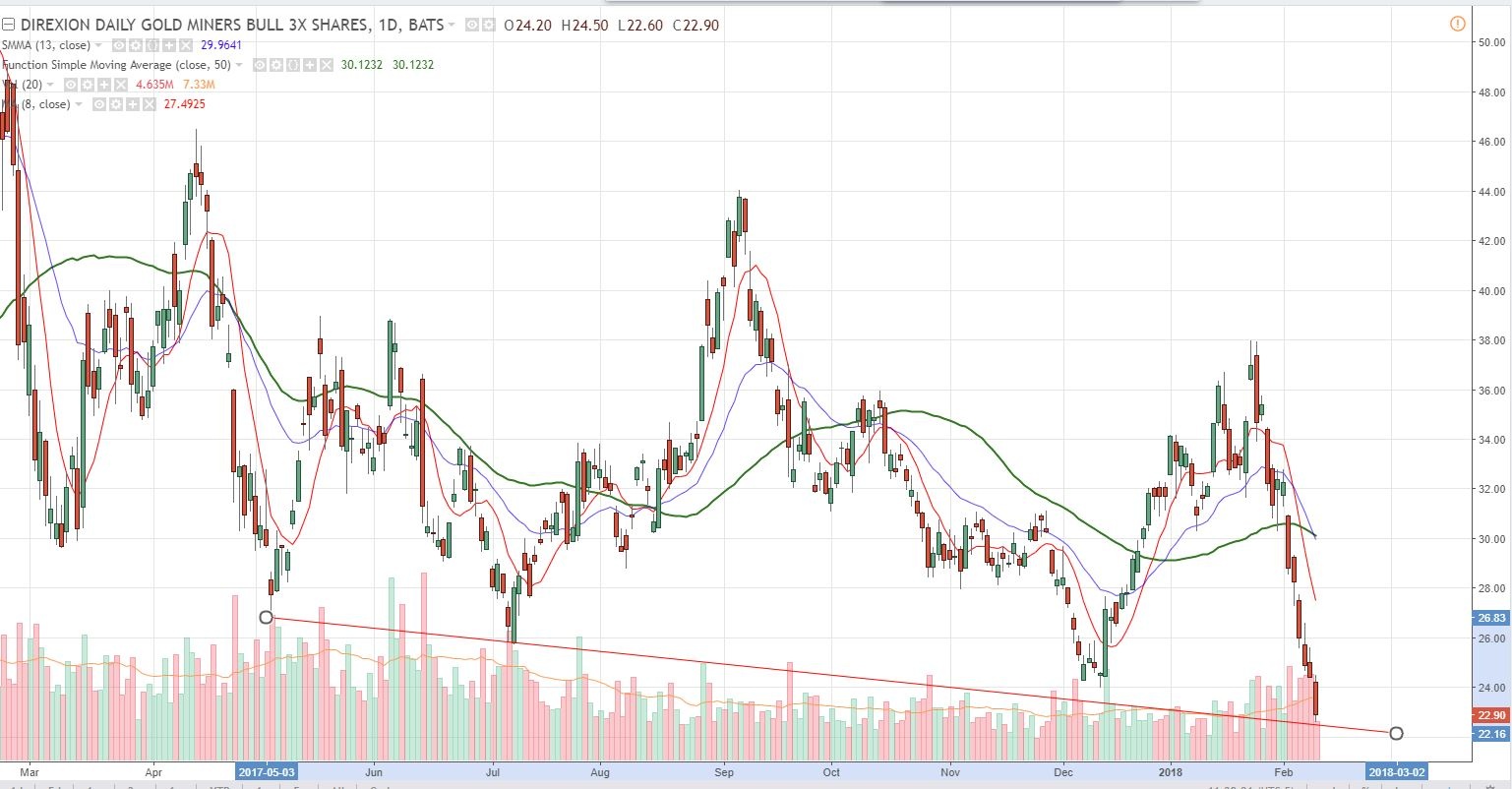 Tough times for “dip buyers” … stocks are headed lower IMO, this week’s “bottom” is likely to be taken out. And I don’t have to tell PM traders how hard it has been to “pick your bottom” lately. I’m 90% in cash looking for a good buying opp. You are not supposed to sell on down days, but my “capital preservation” strategy has saved me a ton of money over the past couple weeks by selling JNUG and TQQQ/UDOW on the way down, booking small losses instead of enduring massive draw downs. Good trading to all!