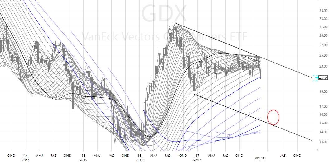 GDX ran the lows of Dec already, not much lower would run all magenta arrows. Crazy, But doable.