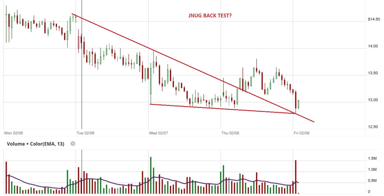 JNUG flagging on the 15 on declining volume which is good, but a break of 11.63 and im out,, I dont trust it over the weekend.