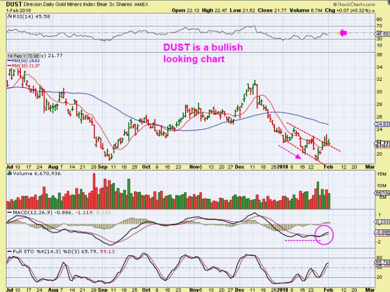 DUST – Personally I can’t say that DUST is bearish looking right now. This looks like a double bottom & the MACD is rising. As DUST dropped, the MACD Flattened & curled higher. I added to JNUG recently, but I have a tight stop, because this is concerning.