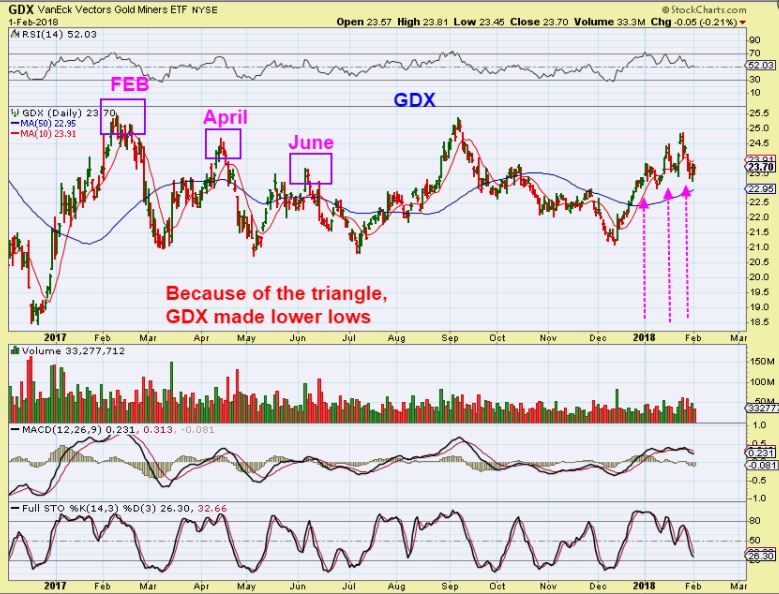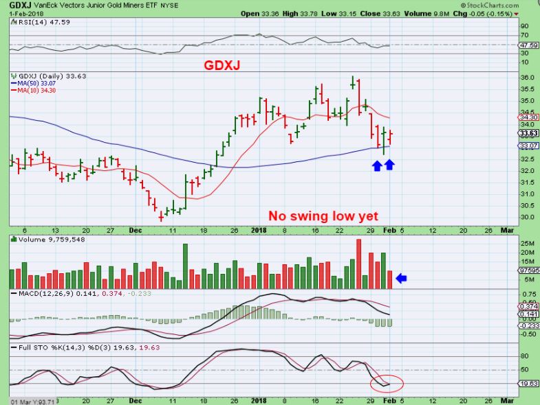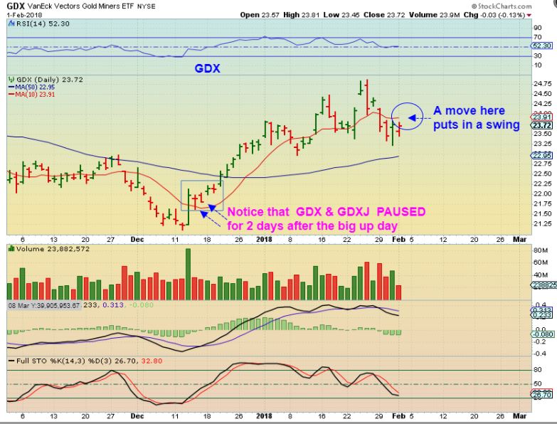 GDX – GDX did not put in a swing low, and that is slightly concerning, but I will address that in a minute. I like to see MINERS lead the way, but you can see that Miners have been a bit choppier than Gold.