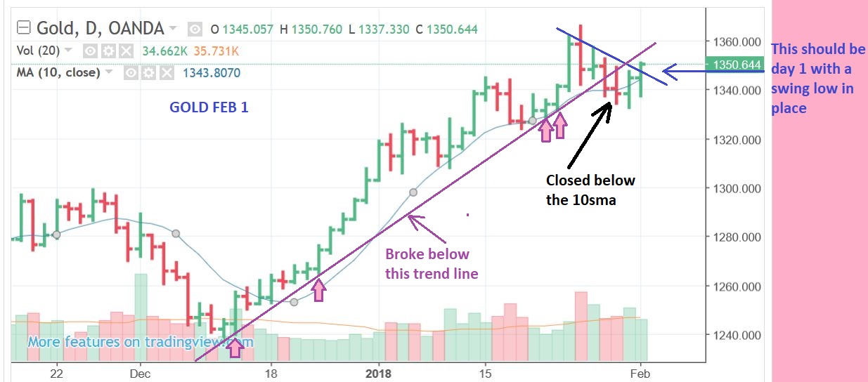 I am not a perma bull – but Fridays action did not really cause damage that is abnormal or beyond repair, and I will need to at least point that out to repair the damage that may have been done to anyones confidence going forward. Many think that GOLD is so ugly right now, but refresh for a chart. Honestly, that remains rather beautiful – it is not ugly, but yes, there could be fiurther downside. Especially being leveraged in a sell off is damaging to confidence so I will try to be unbiased and draw out a safe plan going forward.