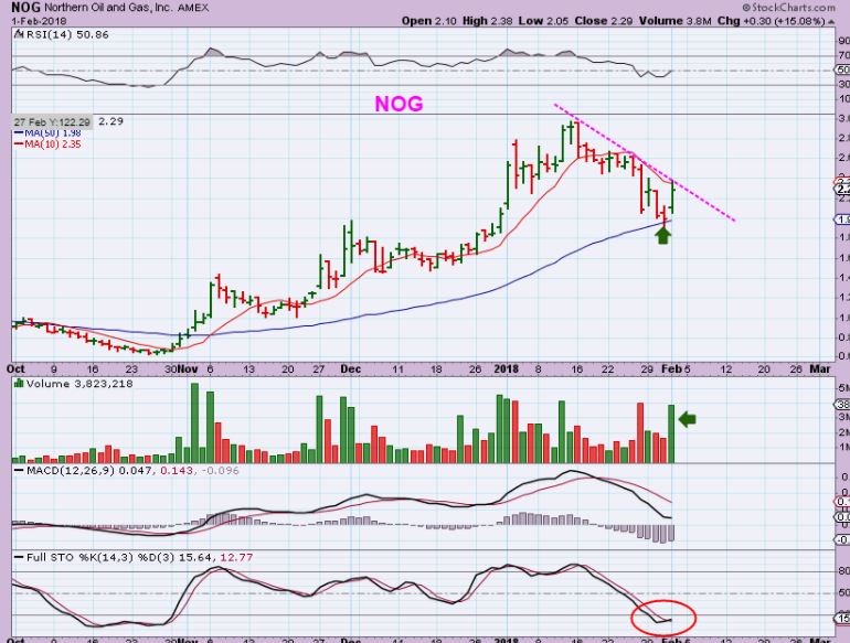 NOG – So I noticed NOG spiking up on volume, off of the 50sma, from oversold conditions. I entered it as a low risk trade. My stop is right below that 50sma. A break higher will be bullish.