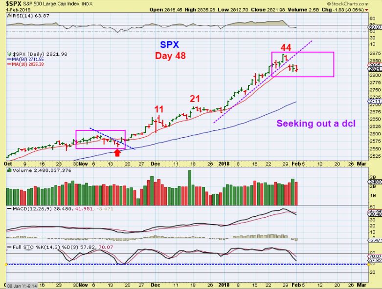 SPX – Expecting a drop into the DCL, we see that the General markets are sliding at this point. Though it looked like they’d recover yesterday, I believe there could be more downside. We will wait for a swing low. I will discuss my thoughts on this further in the weekend report.