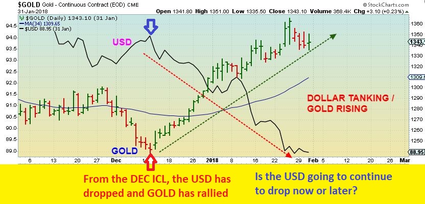 The inverse correlation of GOLD & THE USD is evident. From the DEC ICL, The USD Dropped and GOLD ran higher. So is the USD going to bounce or continue to drop? And will this affect Gold? This muddies the waters a bit too.