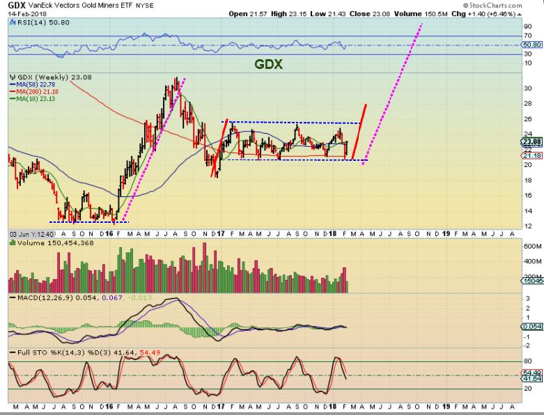 Alex: It appears GDX is in a large triangle starting from the top of July 2017. That may be what is holding this up from moving higher. Of course I can’t draw it:). A breakout of 23.00-23.05 with volume would seem to start a massive move higher given the size of that triangle. We had one filled breakout in January.. Can you confirm or even draw for demonstrative purposes? Thanks Alex