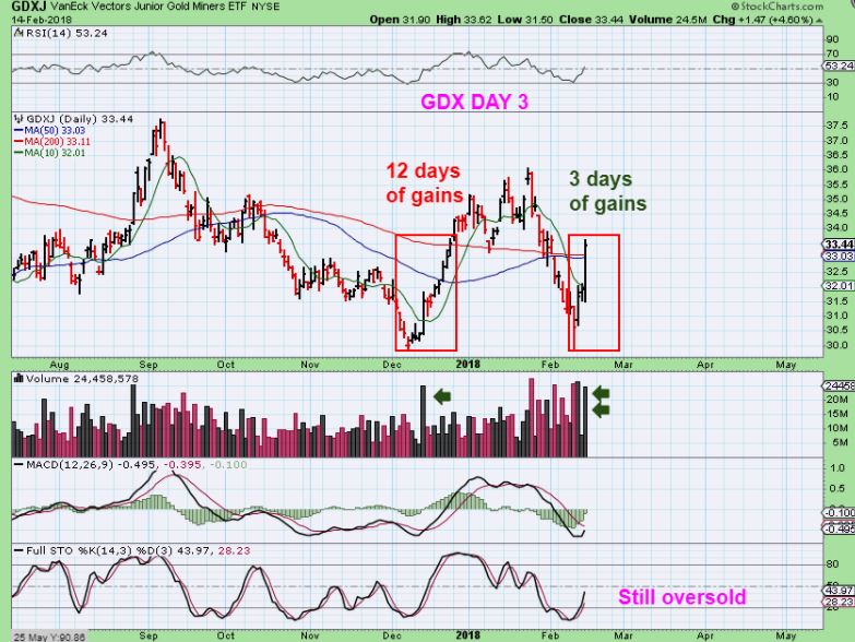 GDX – That run in January 2016 was a shake out launch too. Many went short at the break down, and got trapped. Buyers were dropped off at the very lows and they ‘waited’ for a deeper pull back to get back in, but short covering and buying drove that 2016 run higher than any expected. That pull back never happened for more than a day. Buying with a stop under the lows was better than waiting.