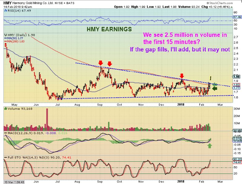 HMY – I posted that I bought HMY ( it was up 5%) , then I grabbed this chart. I bought because it had very big volume right at the start of the day and broke out. This is a break out gap and it ‘might’ fill or we might see a bull flag. If it back tests and fills I might just add, you could ‘buy’.