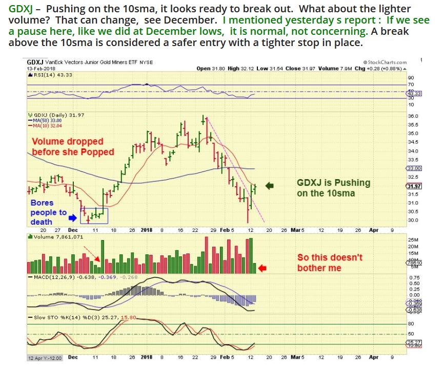 We had the CPI report for January released and inflation was a bit hotter than expected (Inflation). Gold Immediately dropped $10, and I started posting in the comments that I thought it was a fake out. I noted that GDXJ dropped 27 cents, and GDX only dropped 5 cents during all of Pre-Market. I was loading up & commenting that it seemed like a fake drop, and THE TUESDAY MORNING & WEDNESDAY MORNING REPORT ON ‘SPROUTS‘ said ” LOOK FOR A BREAK OVER THE 10SMA & TRENDLINE FOR A CONFIRMED DCL & SAFER ENTRY” Click to enlarge from yesterdays report, it was pretty clear and I had been saying that I bought the reversal Friday and added too. THIS WOULD BE A SAFER BUY AREA.