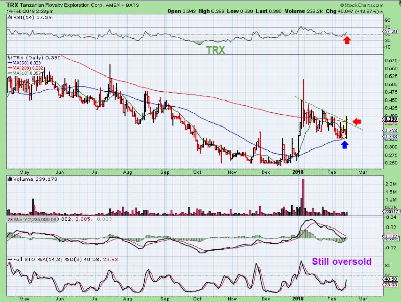 TRX – Notice that TRX also DID NOT sell off to lows in last weeks shake out, instead it found support at the 50sma. Wednesday it Burst higher up 13% when I took this, but it can run a lot higher.