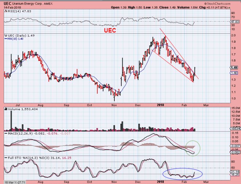 UEC – This popped above a down trend line. It had a strong run in December.