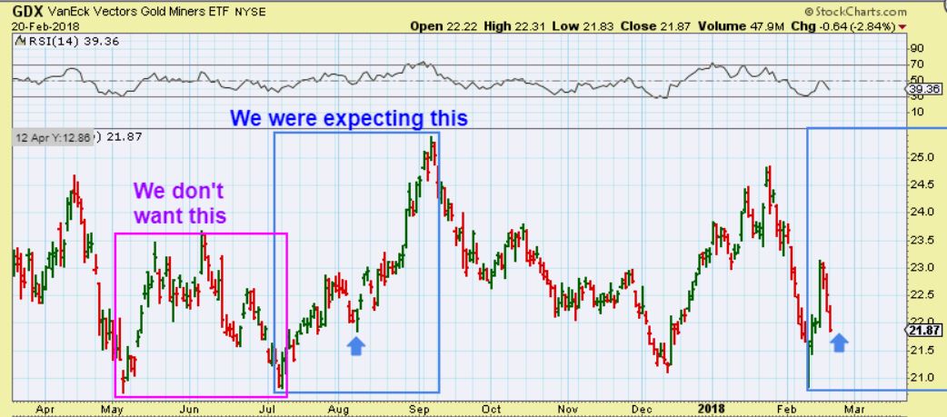GDX CHART #2 & 2 obvious scenarios –  Just looking at recent movement in the Miners, it didn’t matter how good Gold looked,  miners are being accumulated and trading in a range.  WHEN INFLATION CONCERNS came out with the CPI #,  MINERS TOOK OFF!  That is why the FED MINUTES could be a catalyst for Miners if they discuss inflation.  For now? Choices -ALL YOU CAN DO IS SELL & WATCH,  GET BACK IN WHEN THE TIME IS RIGHT?   OR TAKE YOUR CHANCES.  THE LOWS at the CPI were valid entry for a swing low, this pull back is uncalled for.