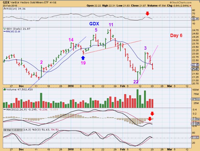 GDX – THIS IS A CAUTIOUS CHART, see if you can follow this for cycle count-   WHAT IF we saw a short first daily cycle to a day 19 DCL. A 2nd daily cycle with a peak on day 11 and a 2nd dcl on day 22. This would now be a 3rd daily cycle, weak, heading to break the lows,  and run all of the stops.  🙁   HOWEVER!!!!!…