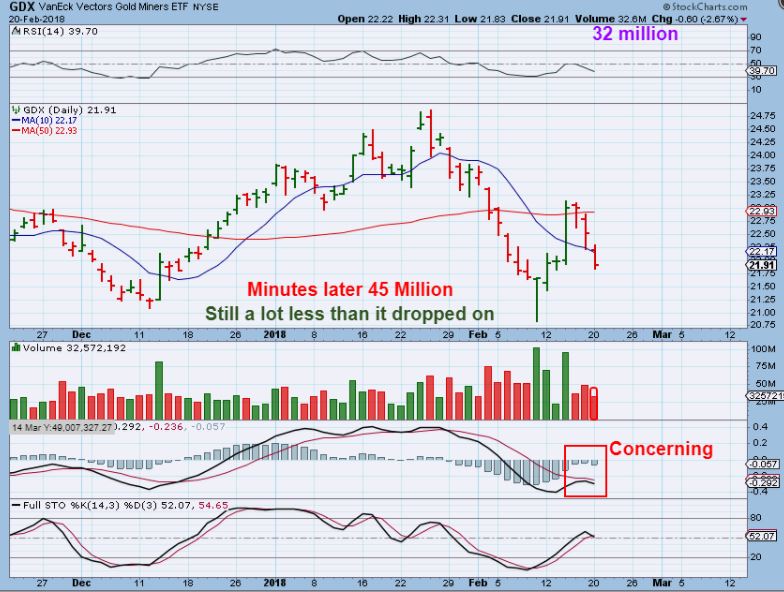 GDXJ – SO far, this drop is 61.8%, and ALMOST a MACD cross.  As I captured this chart, it only showed Vol at 8.7 million.  Minutes later at 4:02 P.M.,  they added to it and it doubled. 16.7 Million total, but that was still 1/2 the volume as the move higher.  THAT is what I like to see.