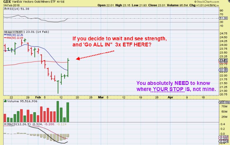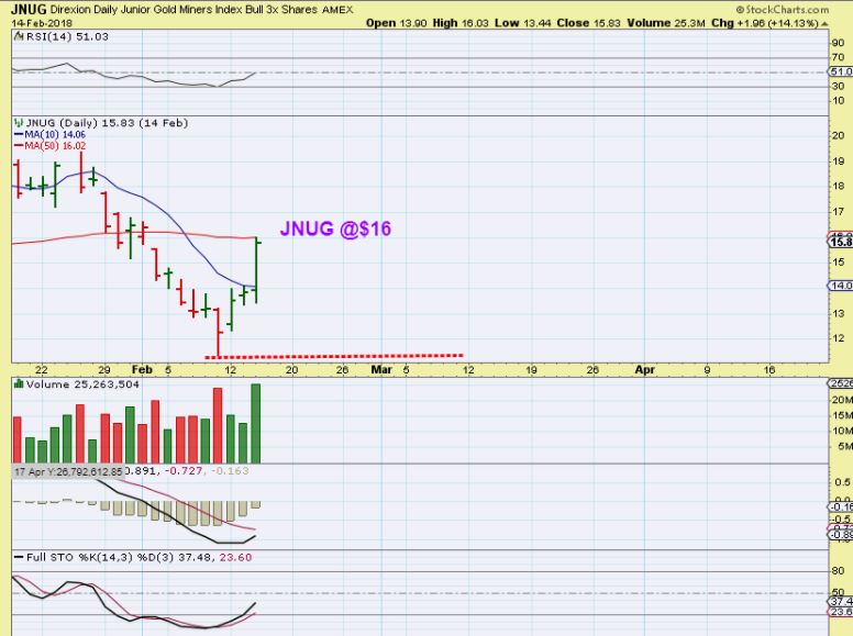 JNUG – I bought JNUG at an average of $12, MY STOP is obviously lower than what someone elses entry should have it at, even if they added 1 or 2 days later.   It is a 3x ETF, Losses come quickly.    A drop from $16 to $12 is mentally draining. “WHERE IS YOUR STOP”! You can always get back in.  This is why only experienced traders should use a 3x etf.